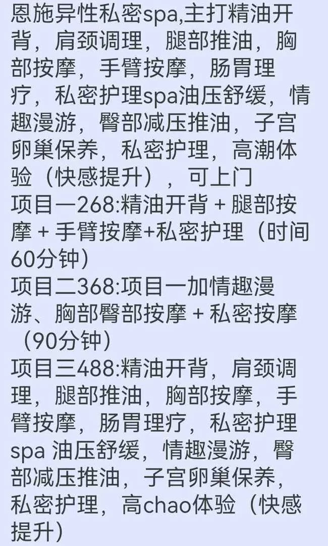 恩施异性私密spa,主打精油开背,肩颈调理,腿部推油,胸部按摩,手臂按摩,肠胃理疗,私密护理spa油压舒缓,情趣漫游,臀部减压推油,子宫卵巢保养,私密护理。
